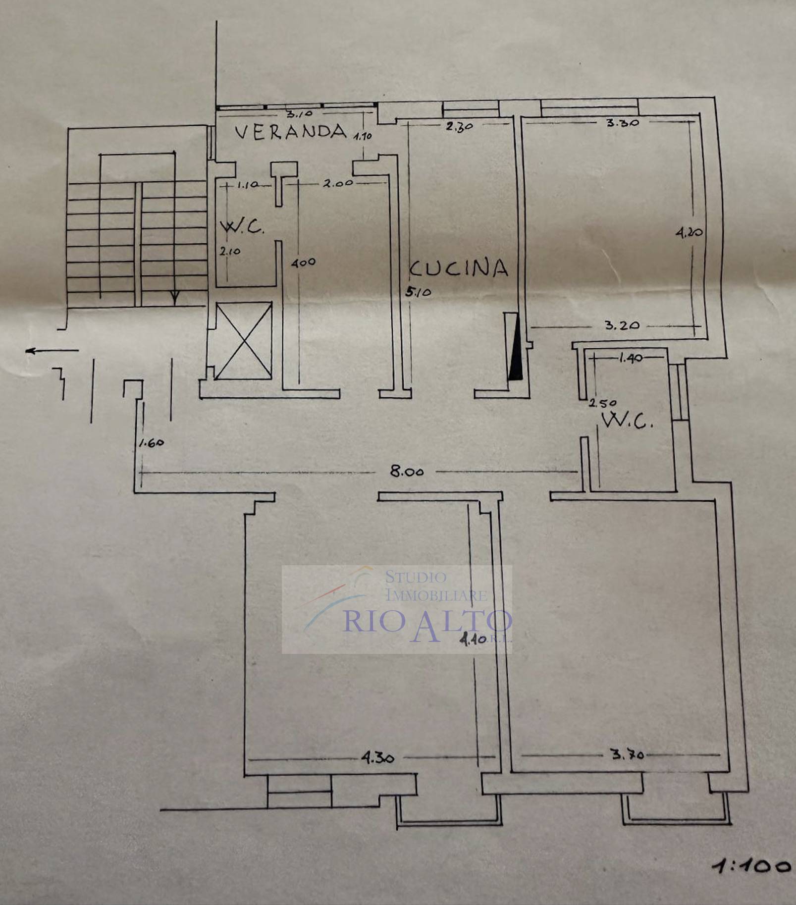 ingresso, cucina, soggiorno, 2 camere matrimoniali, una camera singola, 2 bagni, veranda e due balconi con poggiolo.