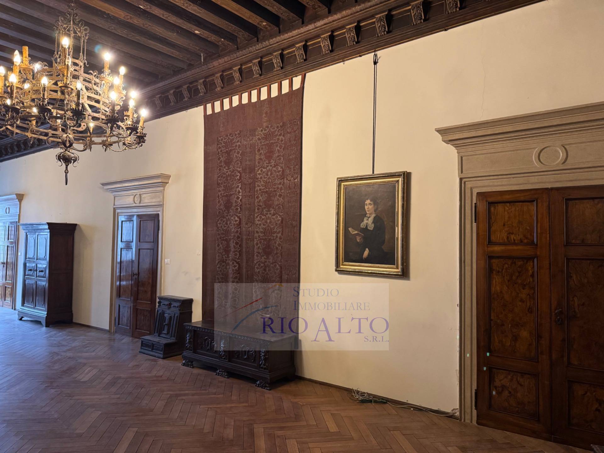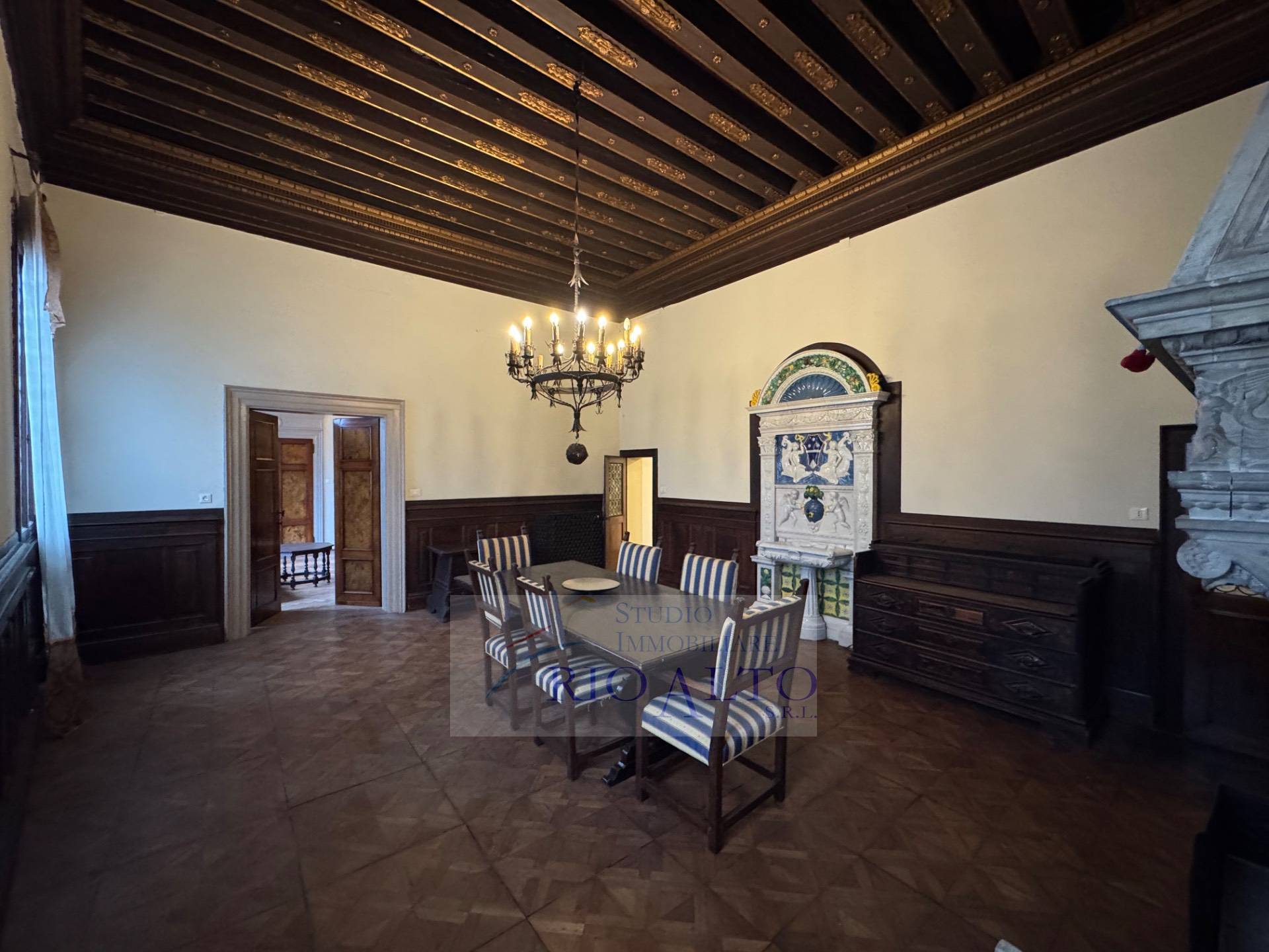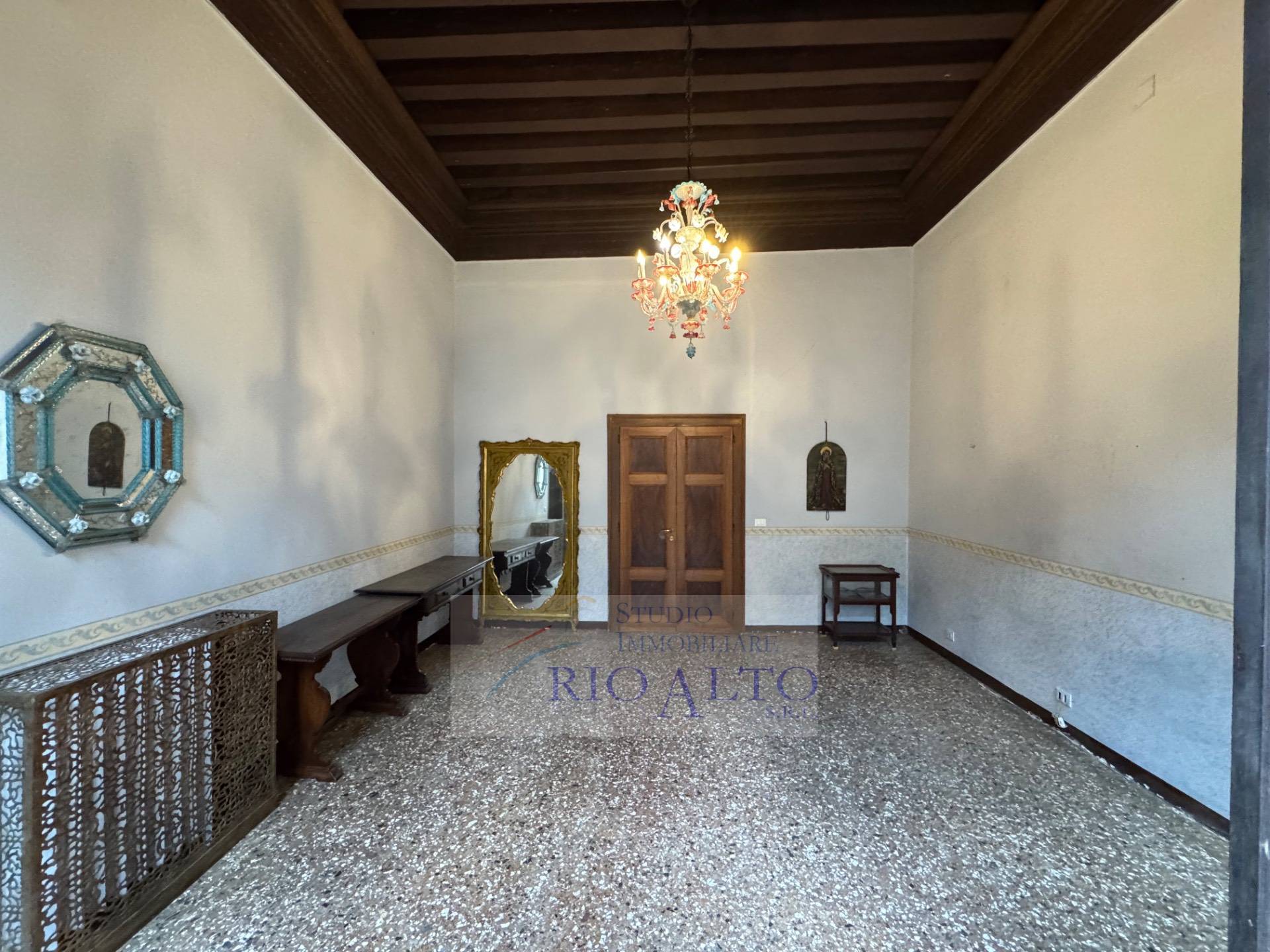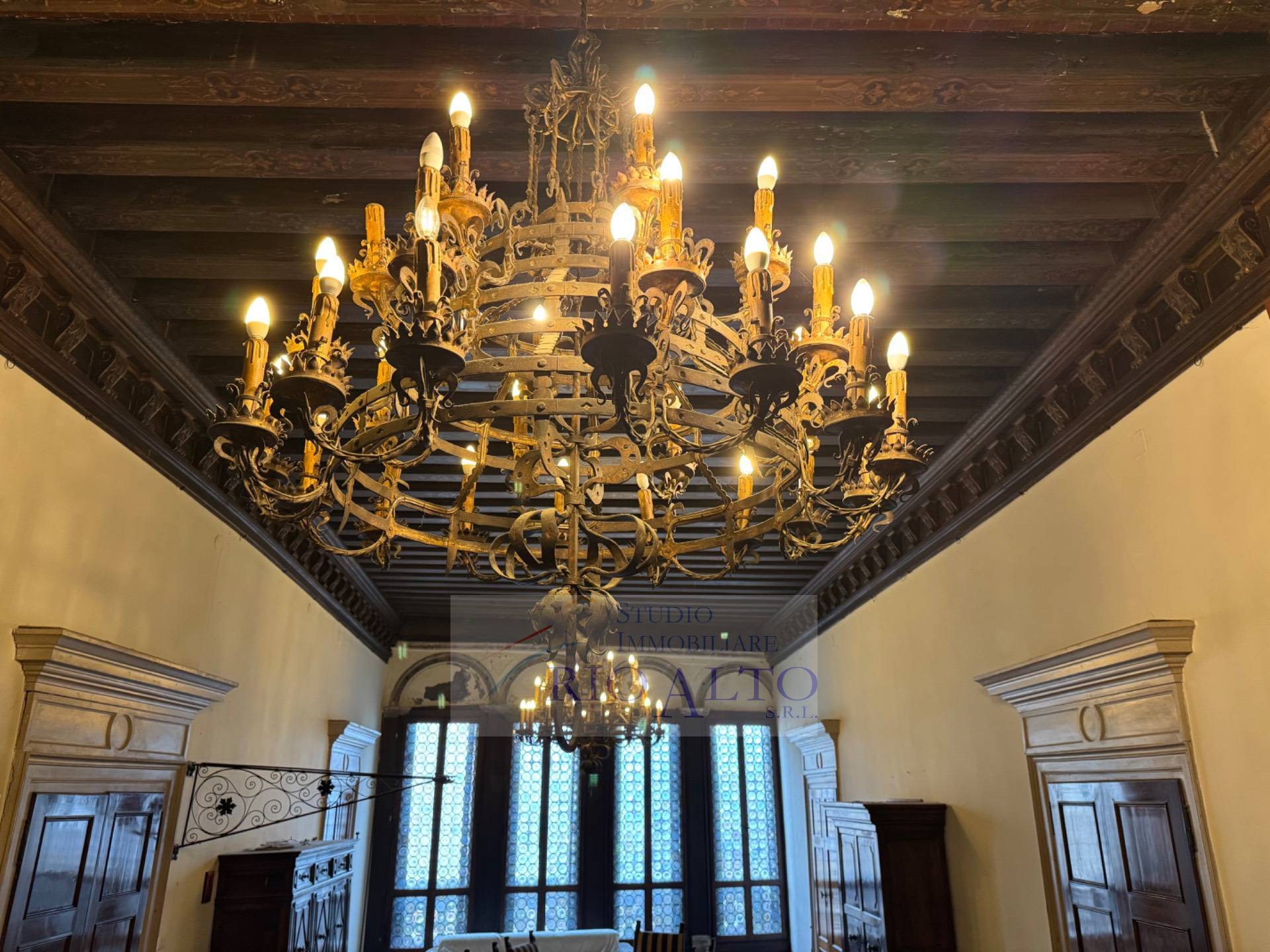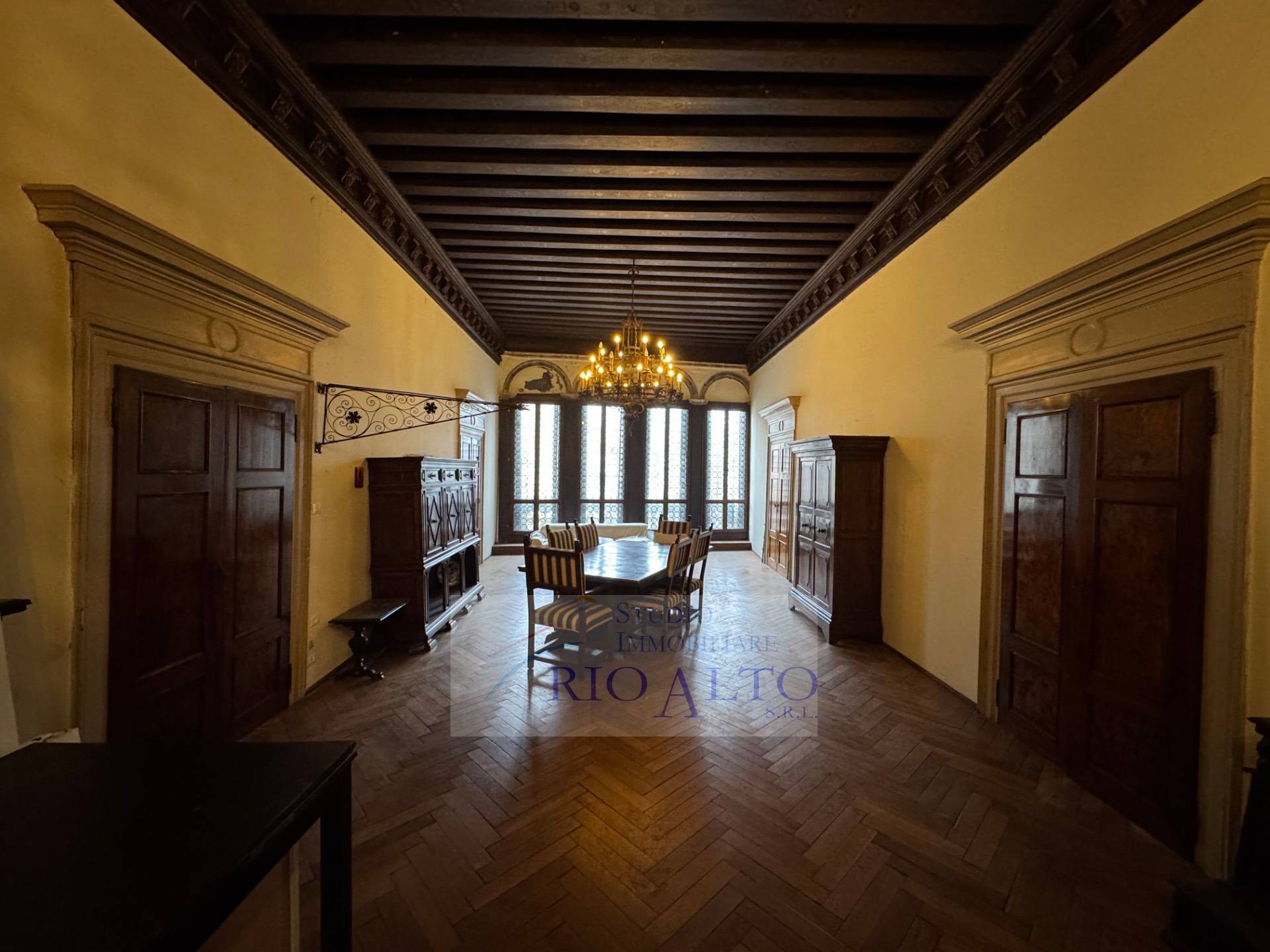 l'ingresso - al primo piano dopo aver percorso l'androne molto raffinato e le scale molto comode - si trova direttamente sul maestoso salone centrale, di ampie dimensioni, con travatura a vista a 4,60 metri di altezza, finemente decorata, fantastici lampadari ai soffitti, una quadrifora con uscita sulla terrazzina che affaccia sul campo e su canale.