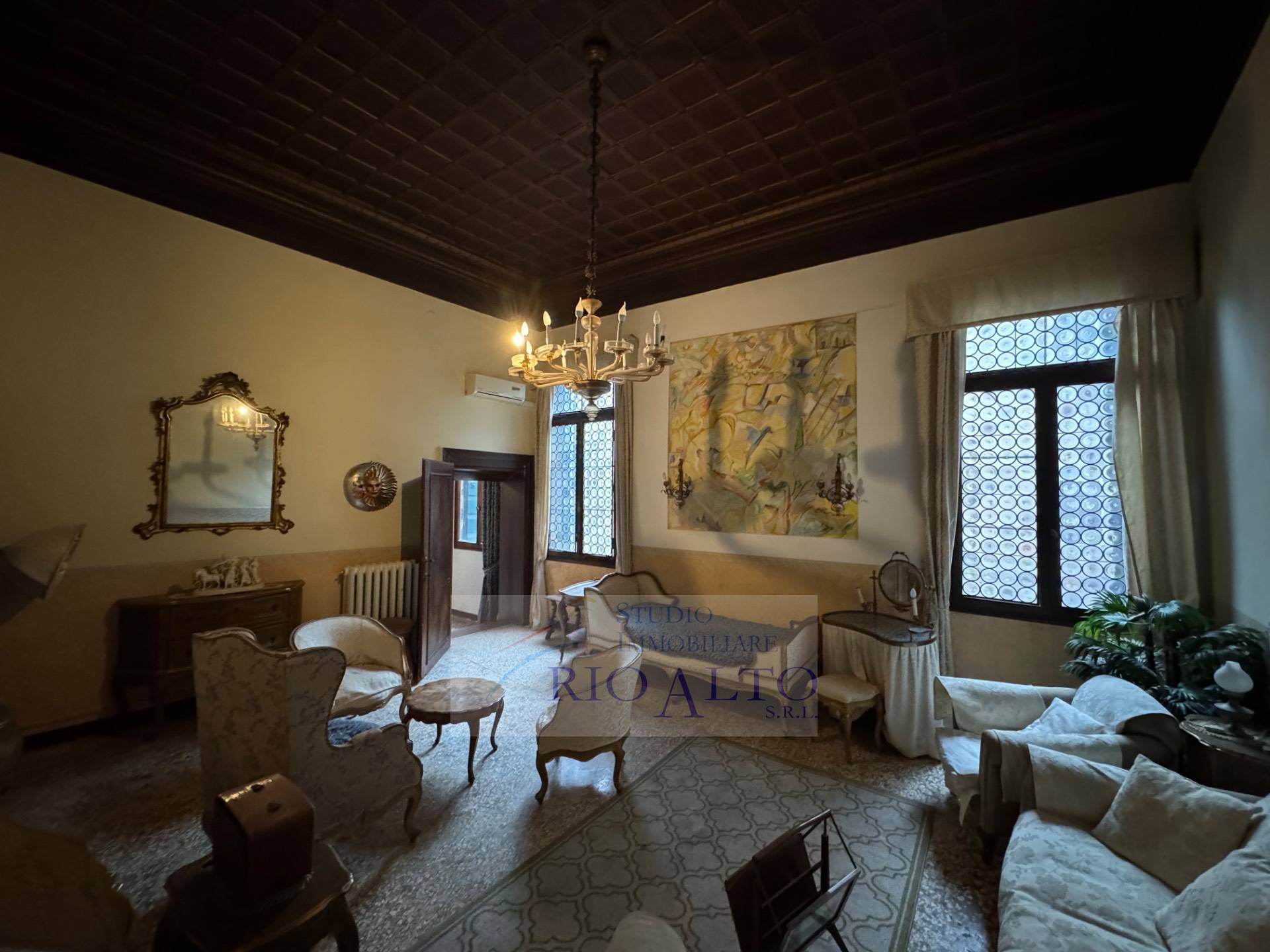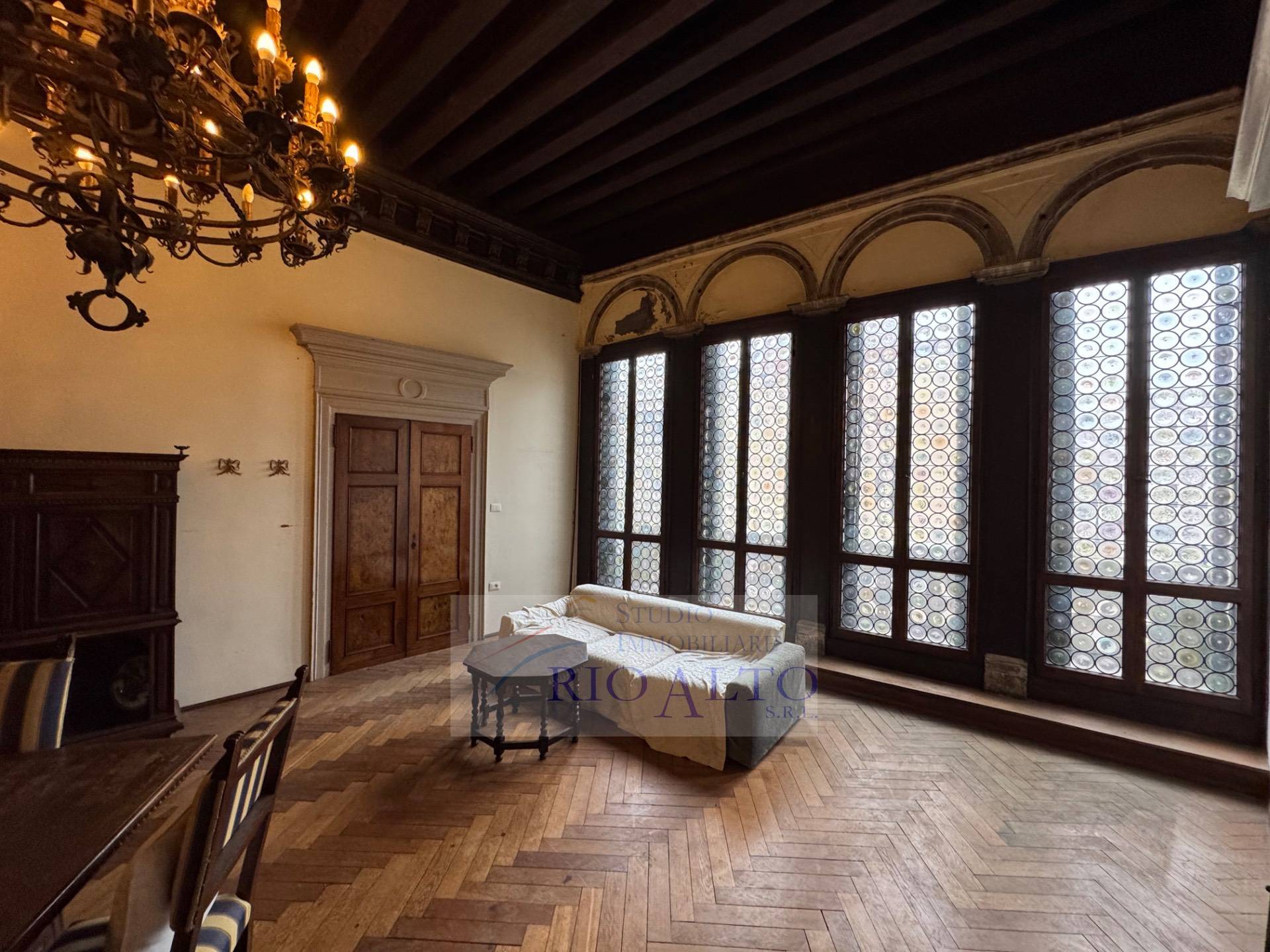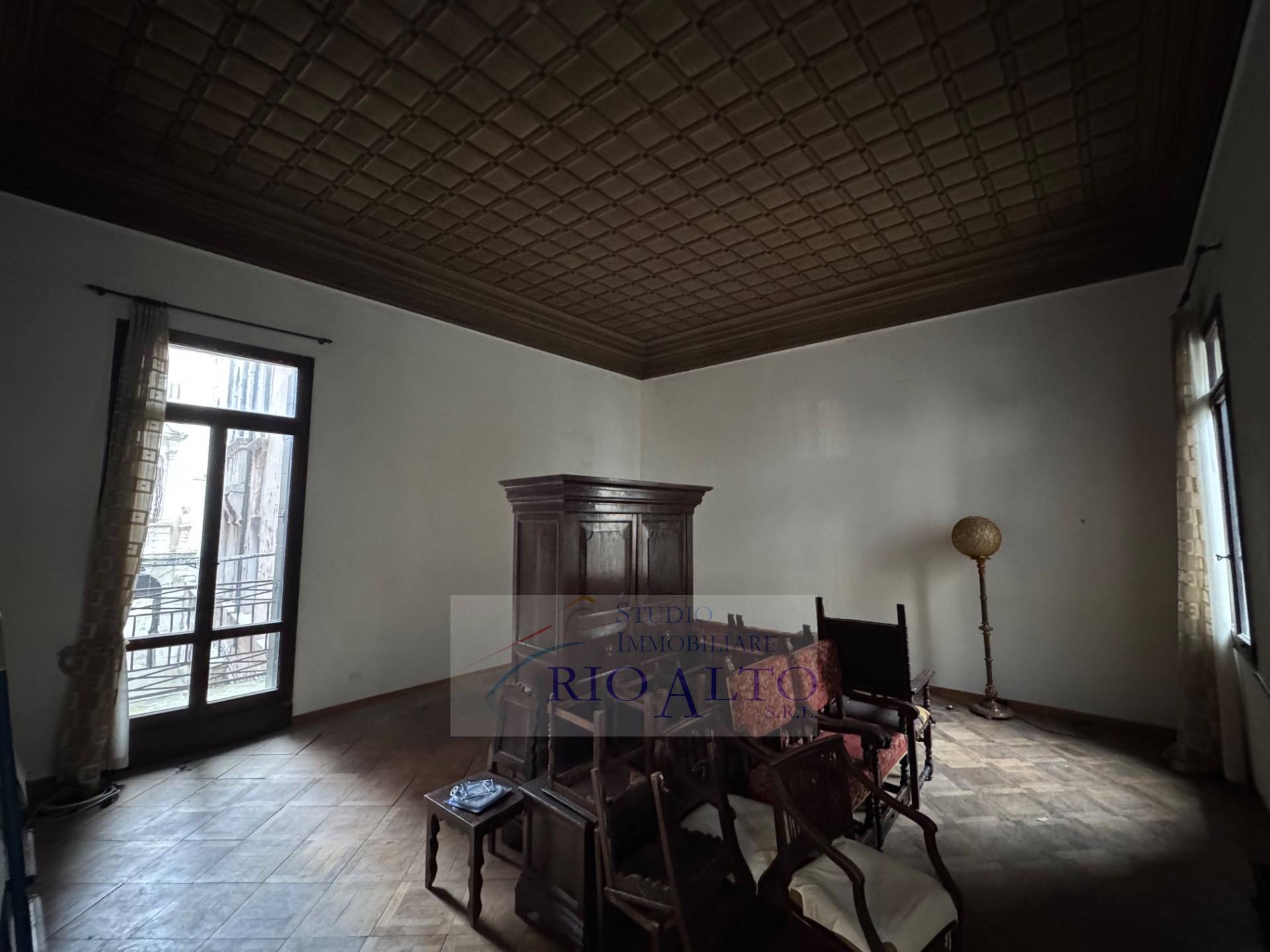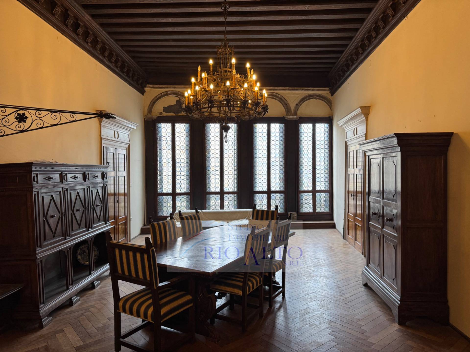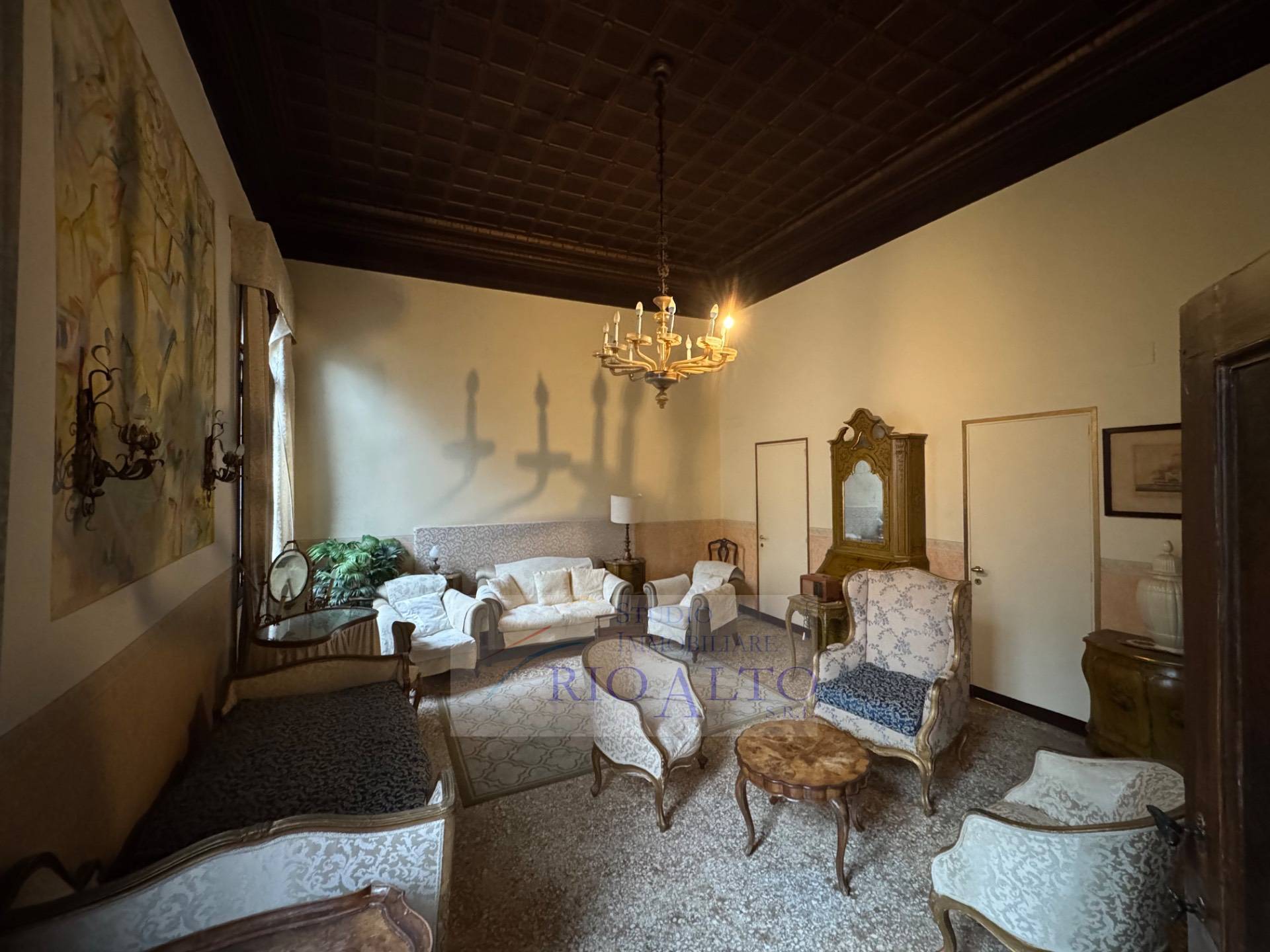 l'ingresso - al primo piano dopo aver percorso l'androne molto raffinato e le scale molto comode - si trova direttamente sul maestoso salone centrale, di ampie dimensioni, con travatura a vista a 4,60 metri di altezza, finemente decorata, fantastici lampadari ai soffitti, una quadrifora con uscita sulla terrazzina che affaccia sul campo e su canale.