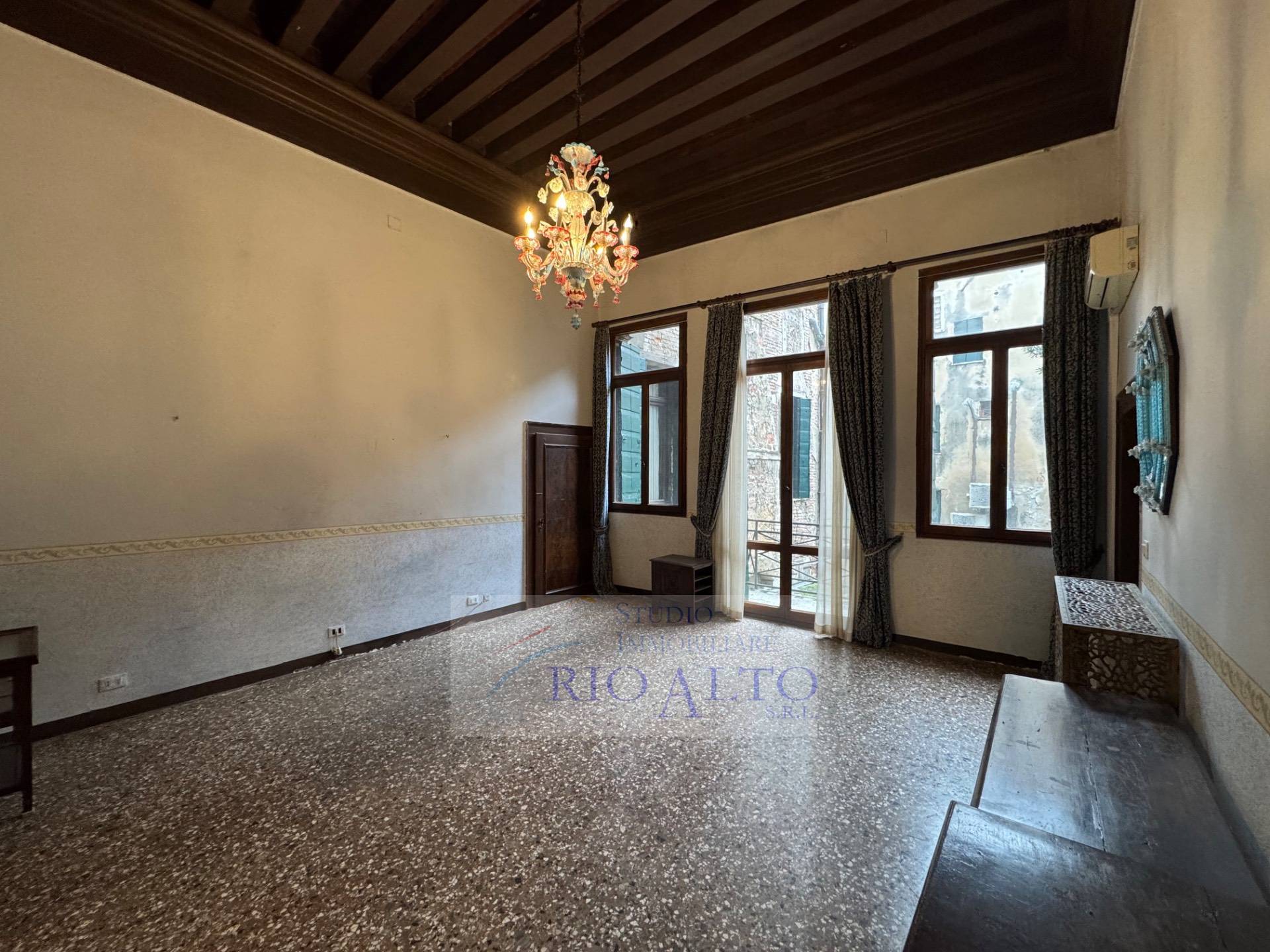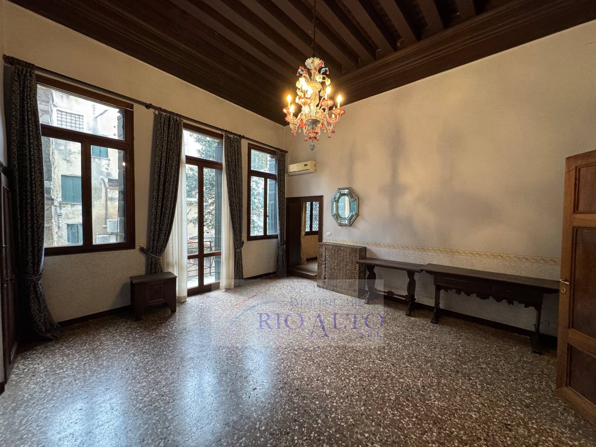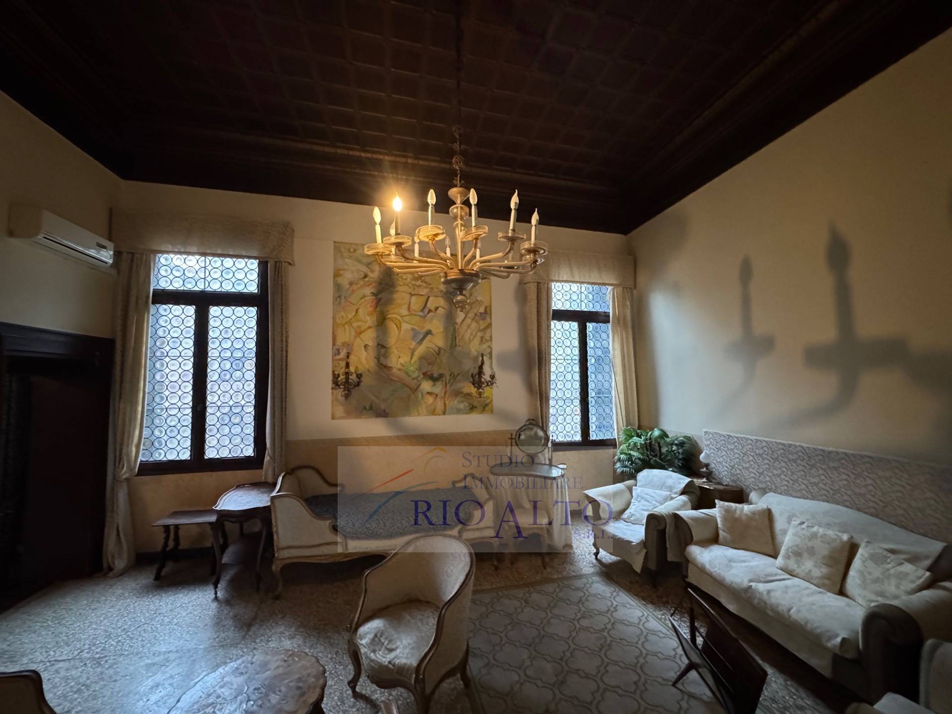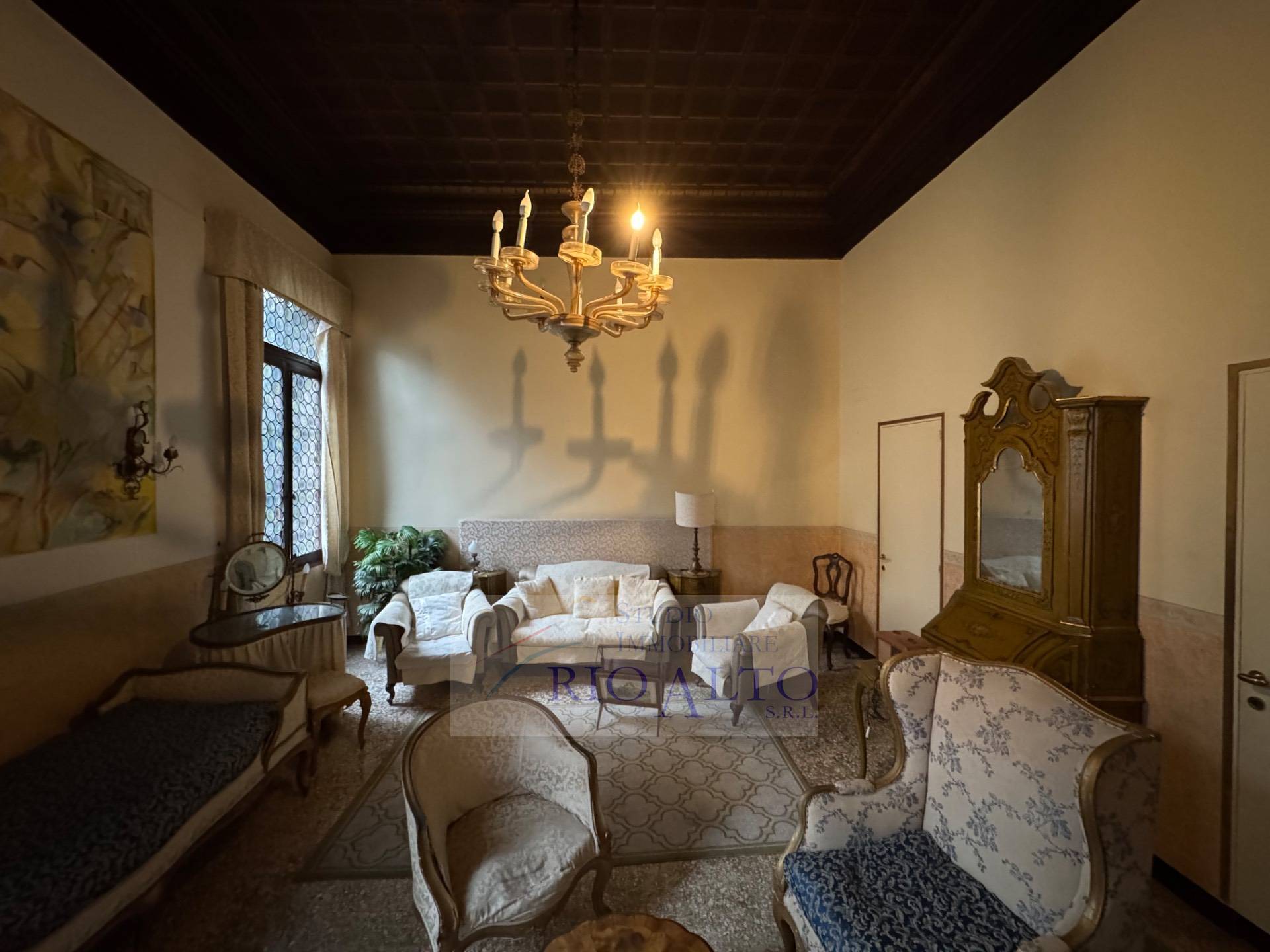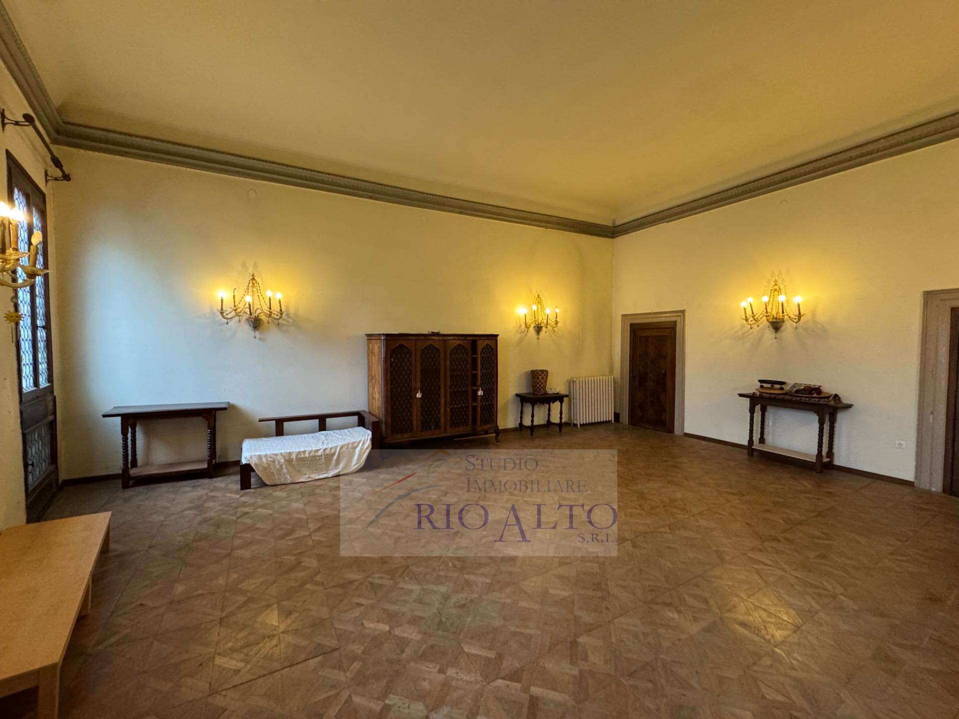 l'ingresso - al primo piano dopo aver percorso l'androne molto raffinato e le scale molto comode - si trova direttamente sul maestoso salone centrale, di ampie dimensioni, con travatura a vista a 4,60 metri di altezza, finemente decorata, fantastici lampadari ai soffitti, una quadrifora con uscita sulla terrazzina che affaccia sul campo e su canale.
